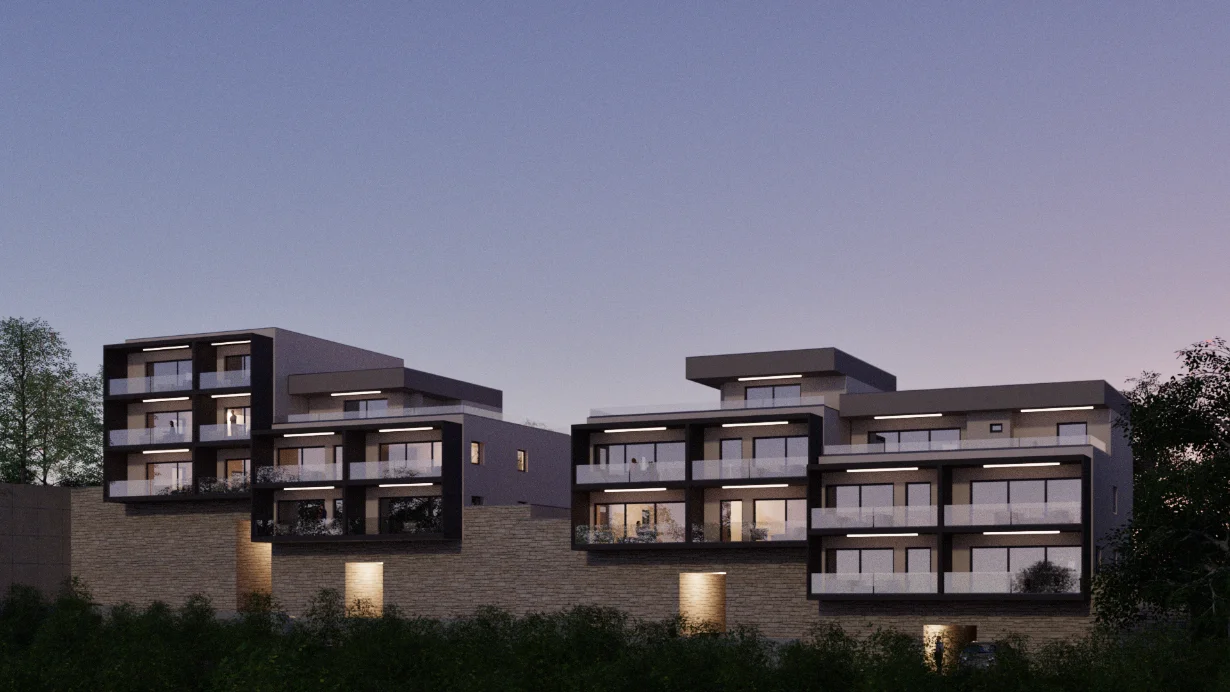 Svaka zgrada se sastoji od prizemlja i dva kata. Zgrade imaju podzemnu garažu, stanovi u prizemlju površine su 62 m2 sa balkonom od 3 m2 sa jednim pripadajućim vrtom od 10m2 i drugim od 4m2. Stanovi na prvom katu su iste površine kao u prizemlju, a na drugom katu se nalazi jedan komforan apartman od 70m2 sa terasom površine 20m2.